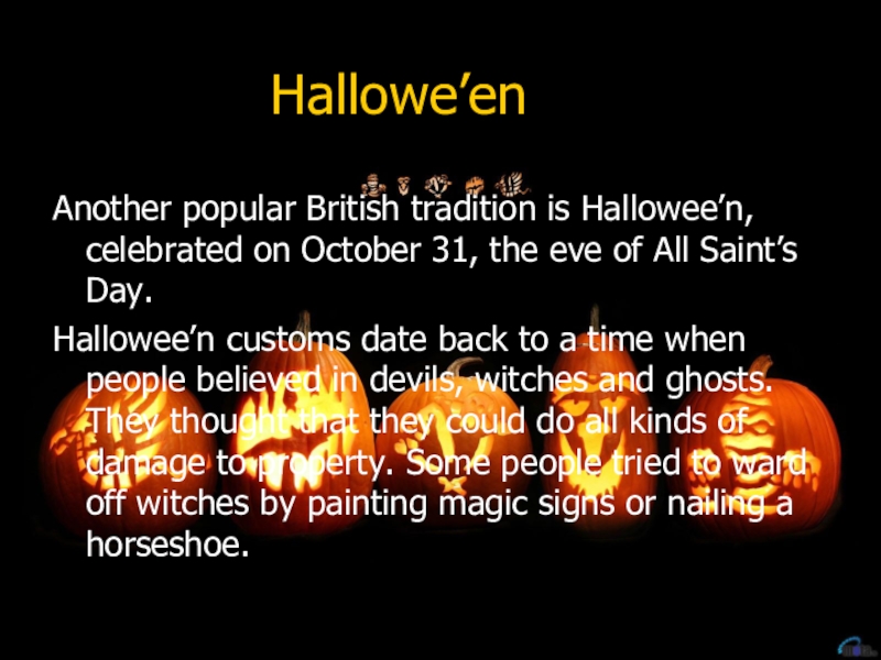 Hallowee’n customs date back to a time when people believed in devils, witches and ghosts. They thought that they could do all kinds of damage to property. Some people tried to ward off witches by painting magic signs or nailing a horseshoe.