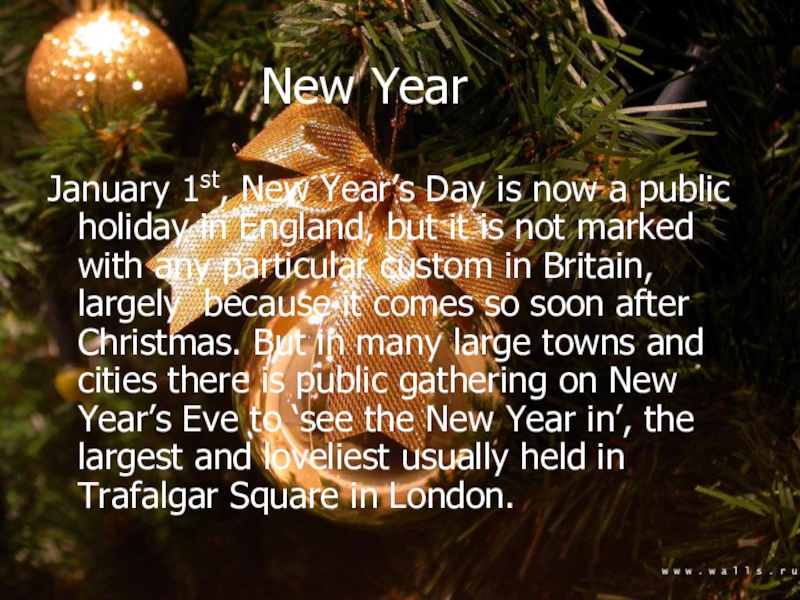 Year’s Day is now a public holiday in England, but it is not marked with any particular custom in Britain, largely because it comes so soon after Christmas. But in many large towns and cities there is public gathering on New Year’s Eve to ‘see the New Year in’, the largest and loveliest usually held in Trafalgar Square in London.