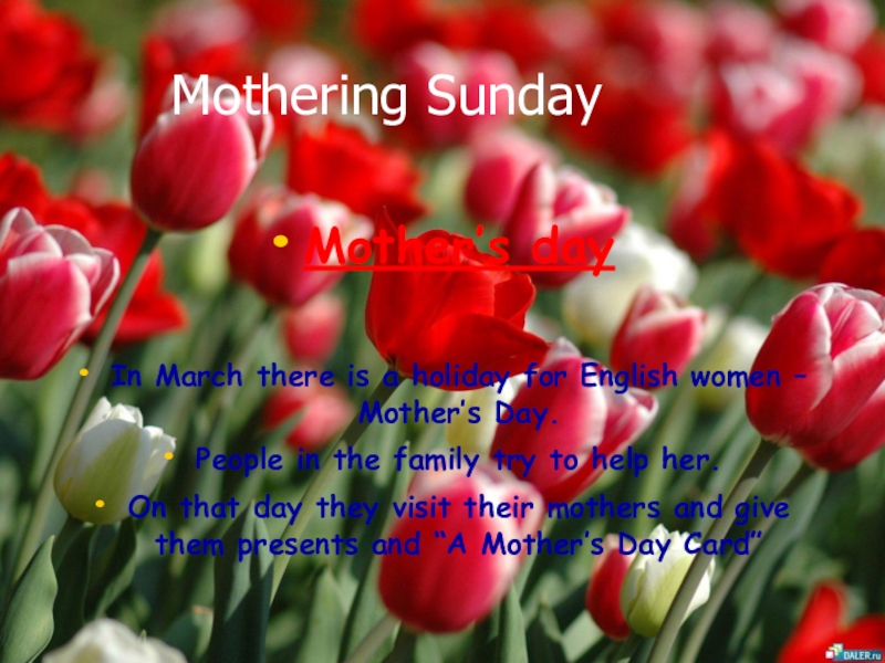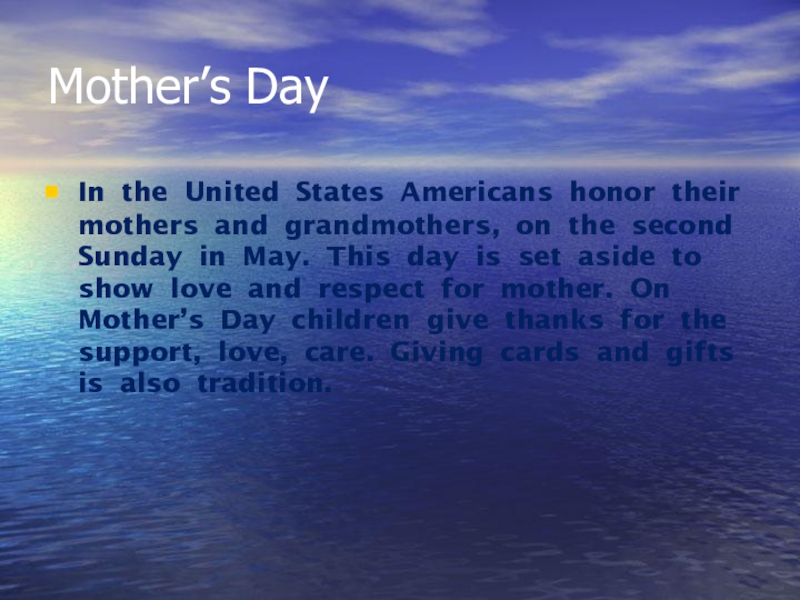 on the second Sunday in May. This day is set aside to show love and respect for mother. On Mother’s Day children give thanks for the support, love, care. Giving cards and gifts is also tradition.