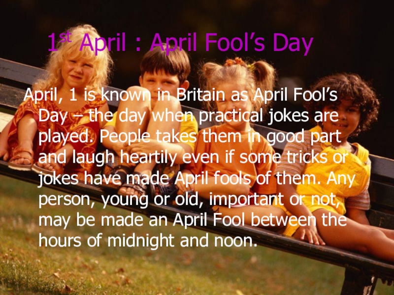 in Britain as April Fool’s Day – the day when practical jokes are played. People takes them in good part and laugh heartily even if some tricks or jokes have made April fools of them. Any person, young or old, important or not, may be made an April Fool between the hours of midnight and noon.