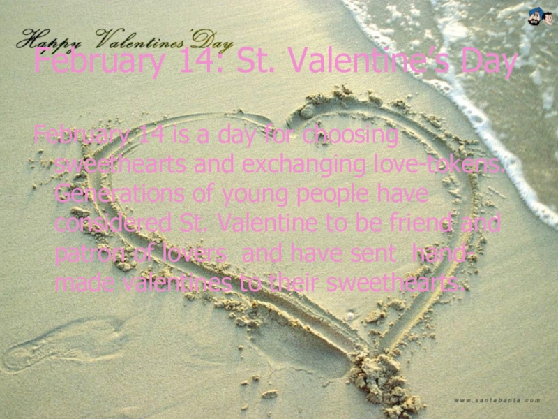 sweethearts and exchanging love-tokens. Generations of young people have considered St. Valentine to be friend and patron of lovers and have sent hand- made valentines to their sweethearts.