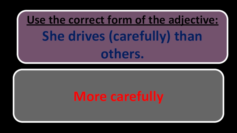 Use the correct form of the adjective:She drives (carefully) than others.More carefully