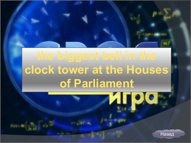 Слайд 24the biggest bell in the clock tower at the Houses of