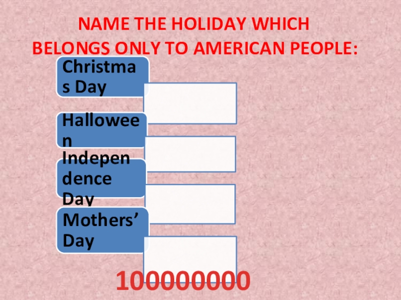 Name the holiday which belongs only to American people:100000000