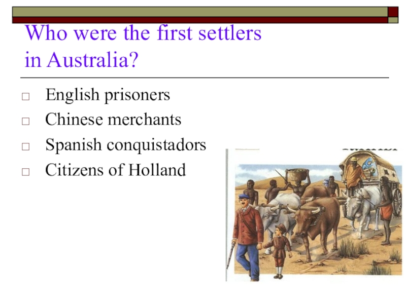 Who were the first settlers  in Australia?English prisonersChinese merchantsSpanish conquistadorsCitizens of Holland