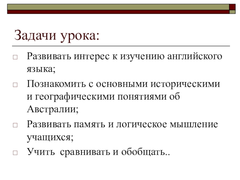 Задачи урока:Развивать интерес к изучению английского языка;Познакомить с основными историческими и географическими понятиями об Австралии;Развивать память и логическое мышление учащихся;Учить сравнивать и обобщать..