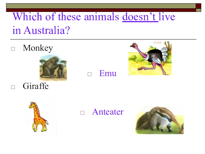 Which of these animals doesn’t live in Australia?MonkeyEmuGiraffeAnteater