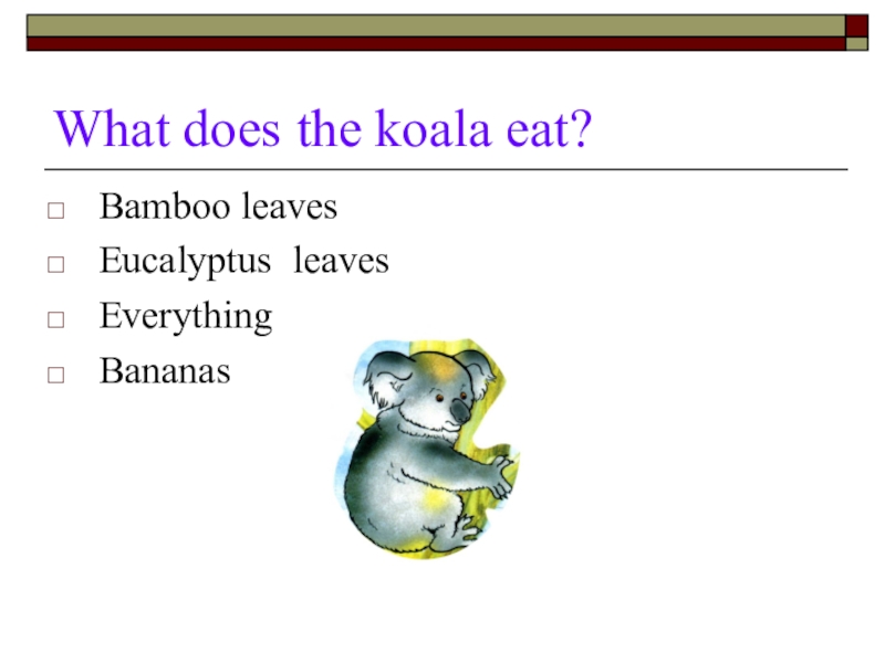What does the koala eat?Bamboo leavesEucalyptus leavesEverythingBananas