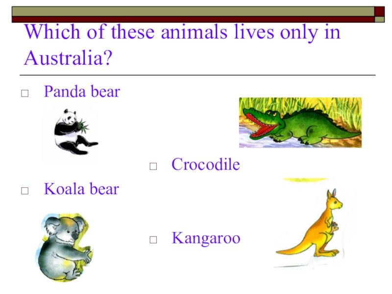 Which of these animals lives only in Australia?Panda bearCrocodileKoala bearKangaroo