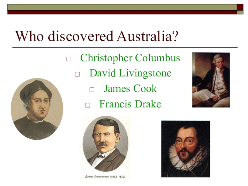 Who discovered Australia?Christopher ColumbusDavid LivingstoneJames CookFrancis Drake