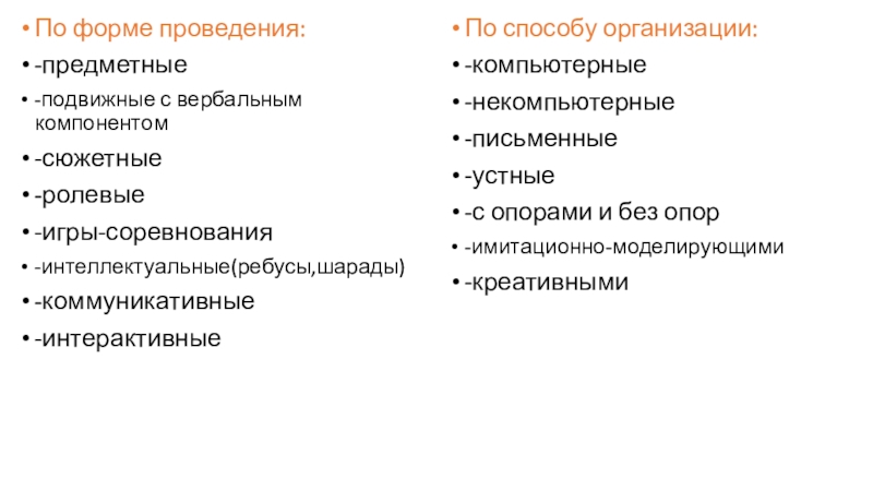По форме проведения:-предметные-подвижные с вербальным компонентом-сюжетные-ролевые-игры-соревнования-интеллектуальные(ребусы,шарады)-коммуникативные-интерактивные По способу организации:-компьютерные-некомпьютерные-письменные-устные-с опорами и без опор-имитационно-моделирующими-креативными