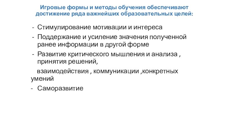 Слайд 7Игровые формы и методы обучения обеспечивают достижение ряда важнейших образовательных целей: