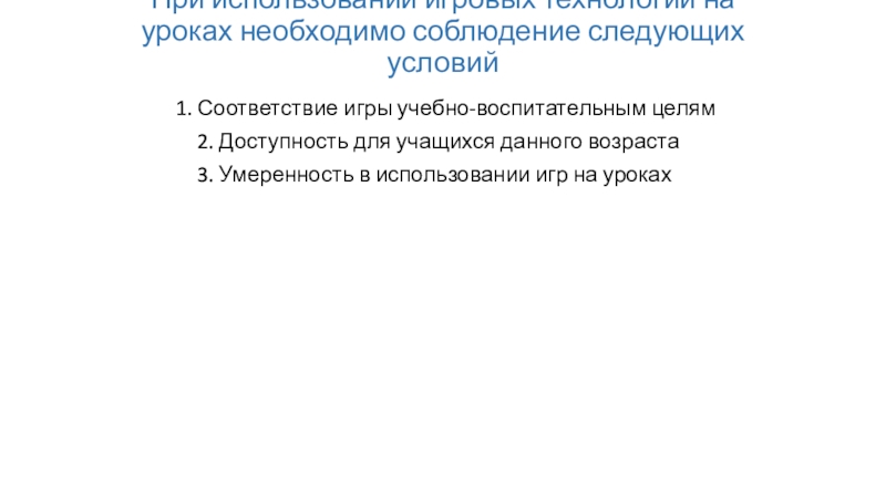 Слайд 2При использовании игровых технологий на уроках необходимо соблюдение следующих условий
