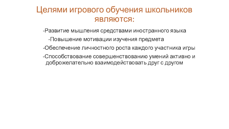 Целями игрового обучения школьников являются:-Развитие мышления средствами иностранного языка       -Повышение мотивации