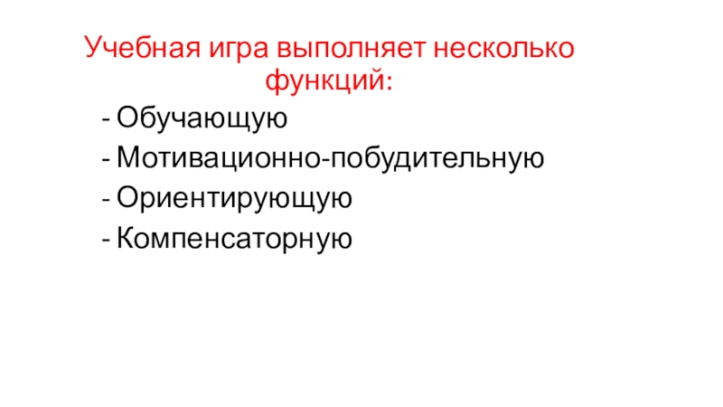 Учебная игра выполняет несколько функций:ОбучающуюМотивационно-побудительнуюОриентирующуюКомпенсаторную