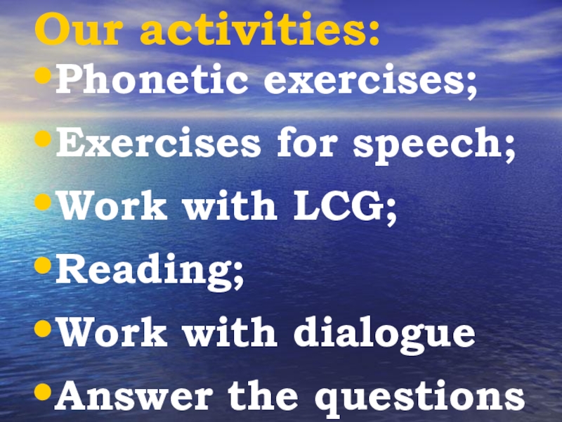 Our activities:Phonetic exercises;Exercises for speech;Work with LCG;Reading;Work with dialogueAnswer the questions
