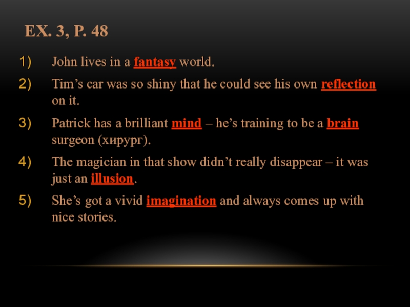 EX. 3, P. 48John lives in a fantasy world.Tim’s car was so shiny that he could see
