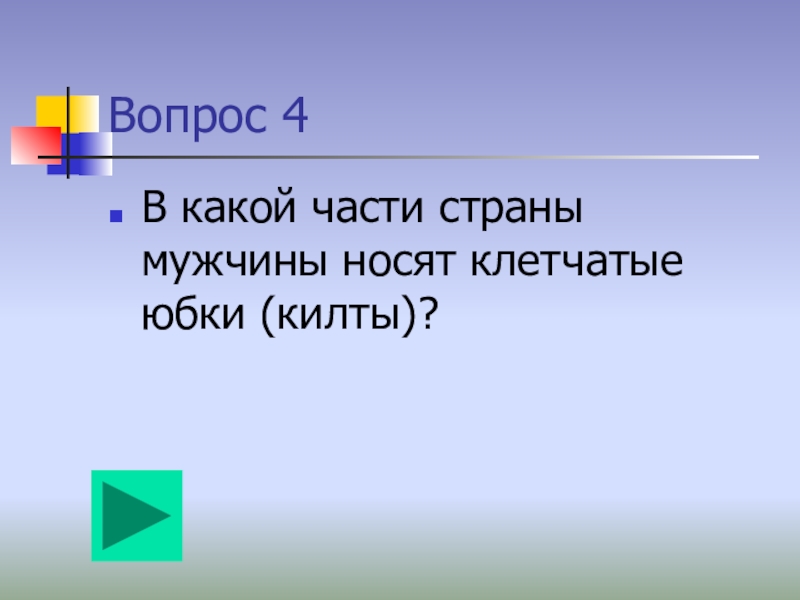Вопрос 4В какой части страны мужчины носят клетчатые юбки (килты)?