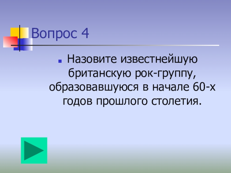 Вопрос 4Назовите известнейшую британскую рок-группу, образовавшуюся в начале 60-х годов прошлого столетия.