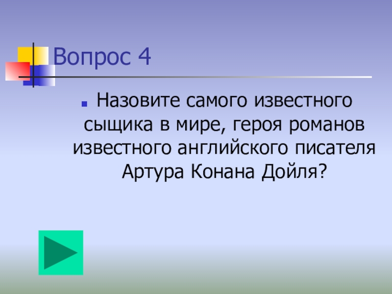 Вопрос 4Назовите самого известного сыщика в мире, героя романов известного английского писателя Артура Конана Дойля?