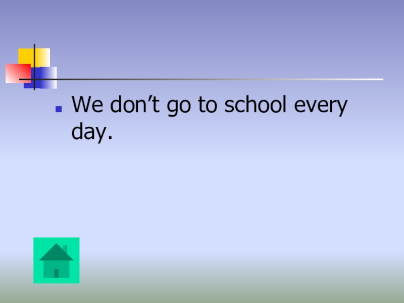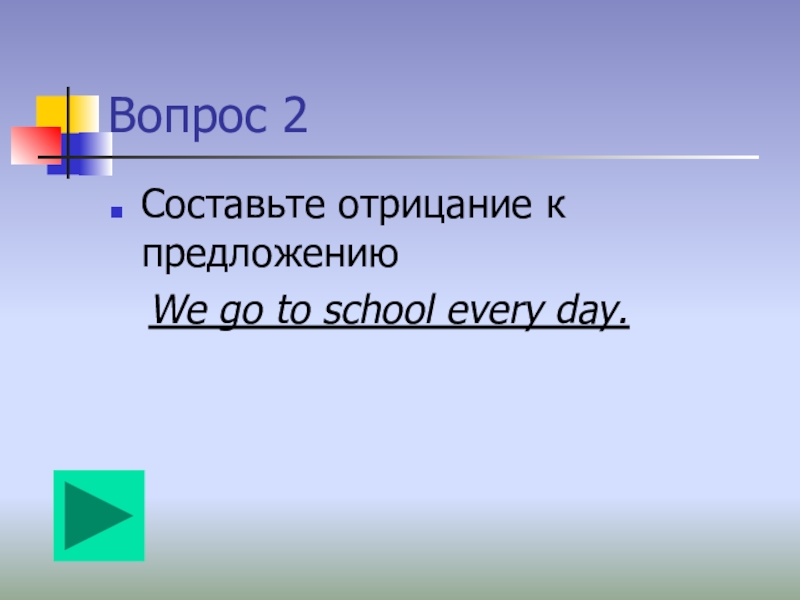Вопрос 2Составьте отрицание к предложению  We go to school every day.