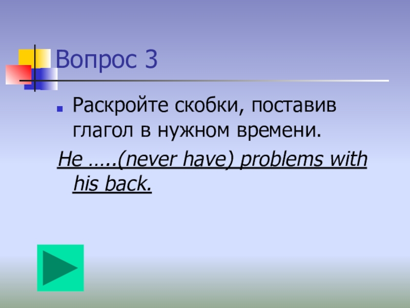 Вопрос 3Раскройте скобки, поставив глагол в нужном времени.He …..(never have) problems with his back.