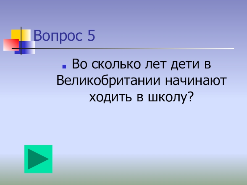 Вопрос 5Во сколько лет дети в Великобритании начинают ходить в школу?