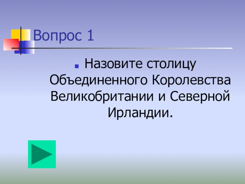 Вопрос 1Назовите столицу Объединенного Королевства Великобритании и Северной Ирландии.