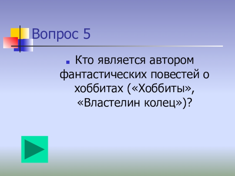 Вопрос 5Кто является автором фантастических повестей о хоббитах («Хоббиты», «Властелин колец»)?