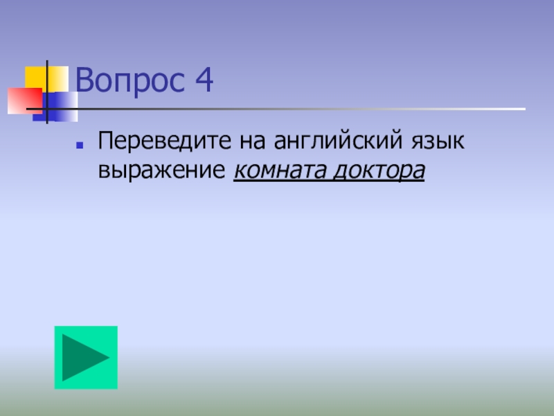 Вопрос 4Переведите на английский язык выражение комната доктора
