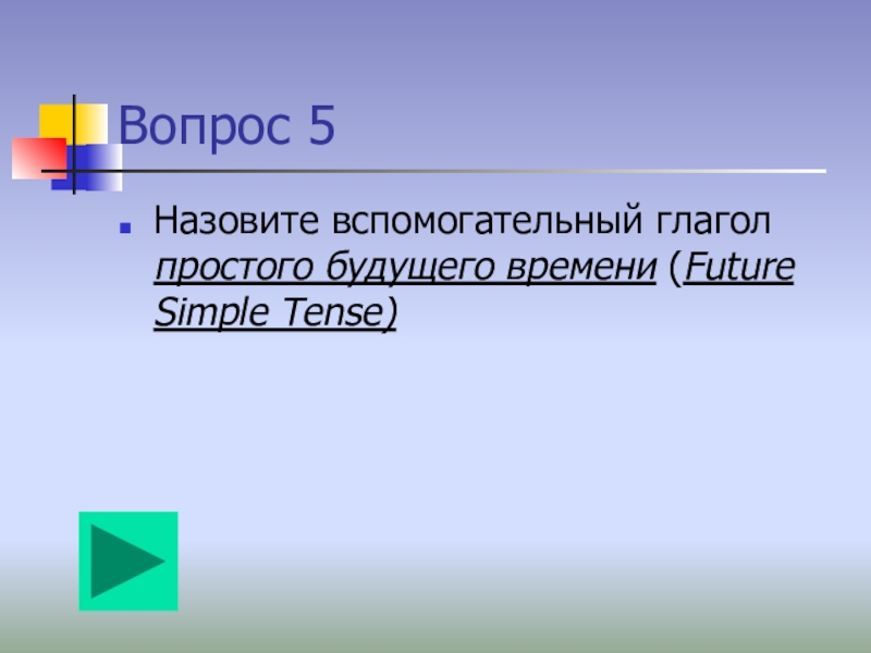 Вопрос 5Назовите вспомогательный глагол простого будущего времени (Future Simple Tense)