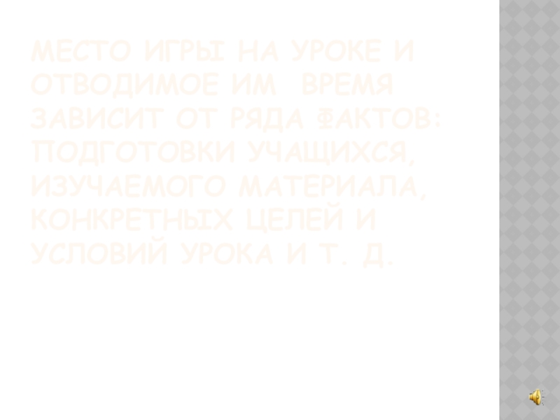 Слайд 7Место игры на уроке и отводимое им время зависит от ряда