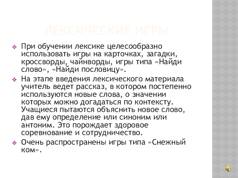 При обучении лексике целесообразно использовать игры на карточках, загадки, кроссворды,