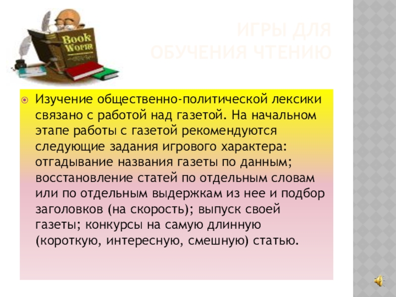 с работой над газетой. На начальном этапе работы с газетой рекомендуются следующие задания игрового характера: отгадывание названия газеты по данным; восстановление статей по отдельным словам или по отдельным выдержкам из нее и подбор заголовков (на скорость); выпуск своей газеты; конкурсы на самую длинную (короткую, интересную, смешную) статью.