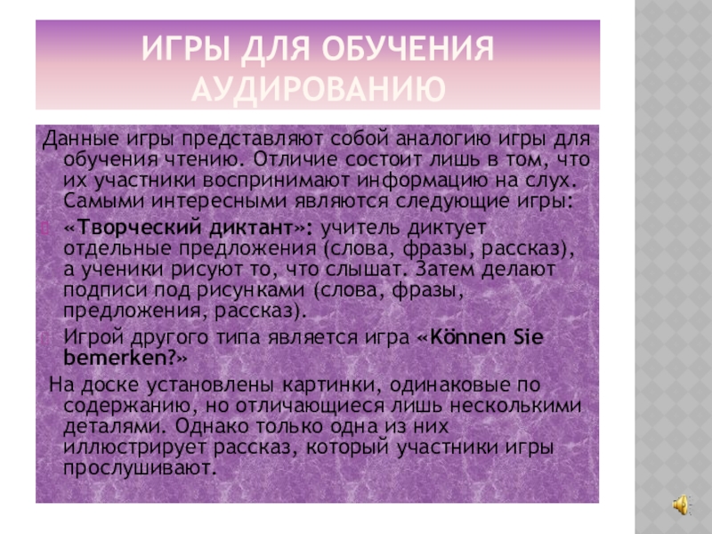 чтению. Отличие состоит лишь в том, что их участники воспринимают информацию на слух. Самыми интересными являются следующие игры: