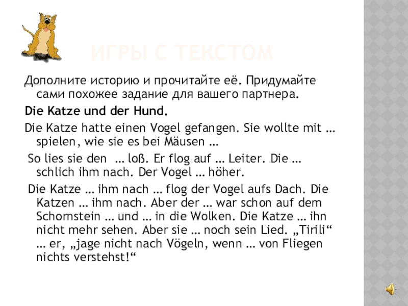 Die Katze … ihm nach … flog der Vogel aufs Dach. Die Katzen … ihm nach. Aber der … war schon auf dem Schornstein … und … in die Wolken. Die Katze … ihn nicht mehr sehen. Aber sie … noch sein Lied. „Tirili“ … er, „jage nicht nach Vögeln, wenn … von Fliegen nichts verstehst!“