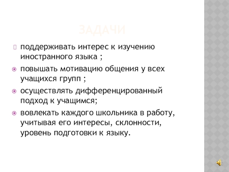 вовлекать каждого школьника в работу, учитывая его интересы, склонности, уровень подготовки к языку.