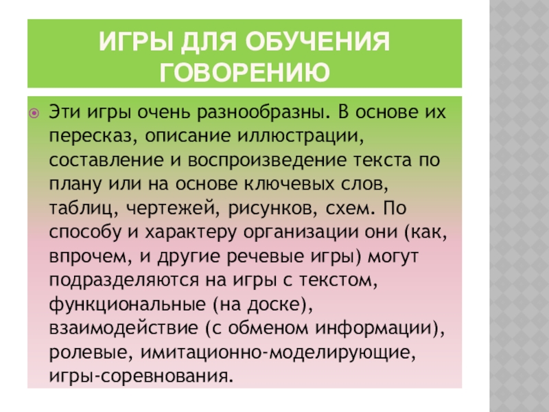 описание иллюстрации, составление и воспроизведение текста по плану или на основе ключевых слов, таблиц, чертежей, рисунков, схем. По способу и характеру организации они (как, впрочем, и другие речевые игры) могут подразделяются на игры с текстом, функциональные (на доске), взаимодействие (с обменом информации), ролевые, имитационно-моделирующие, игры-соревнования.