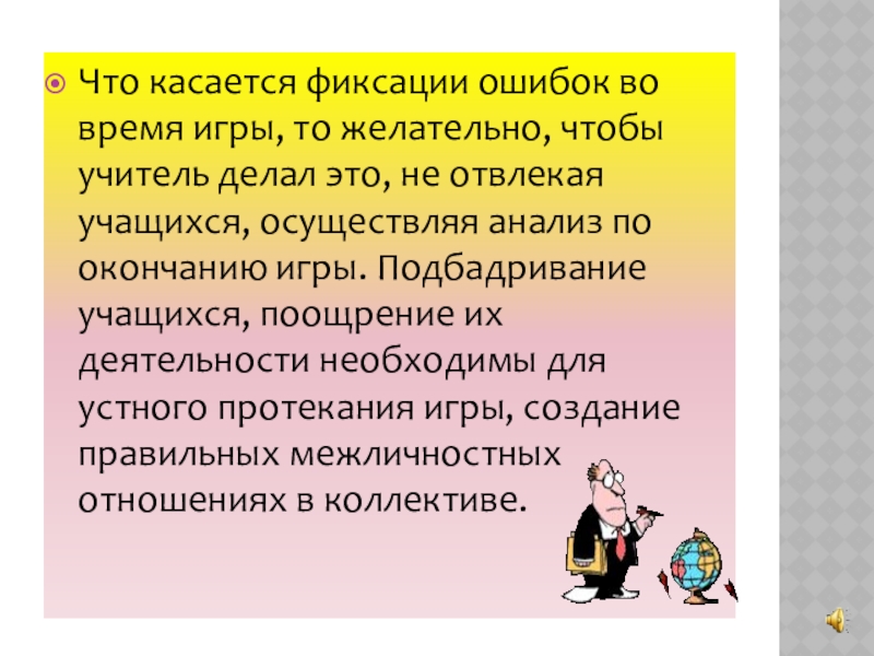 Слайд 8Что касается фиксации ошибок во время игры, то желательно, чтобы учитель