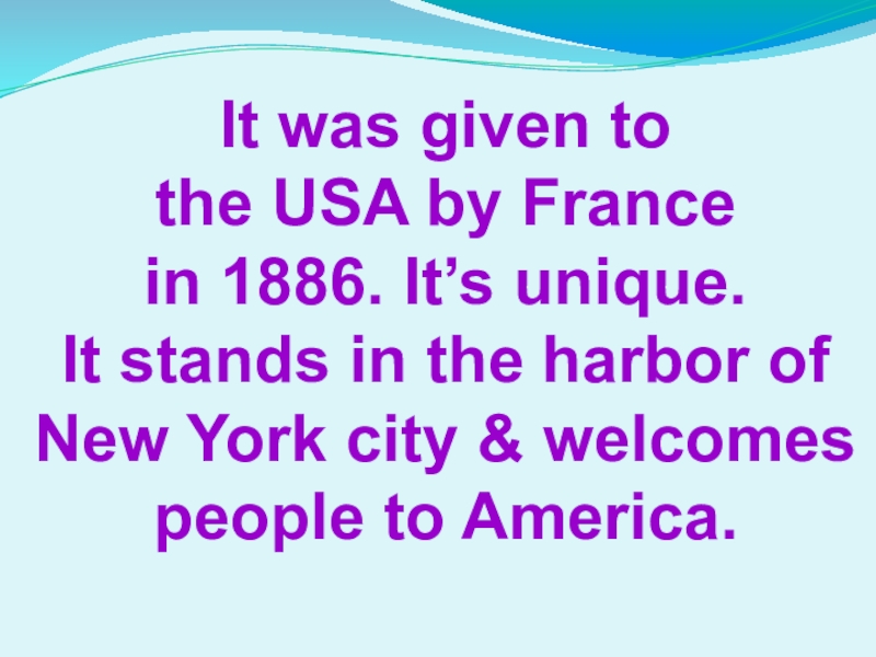 It was given to the USA by France in 1886. It’s unique. It stands in the