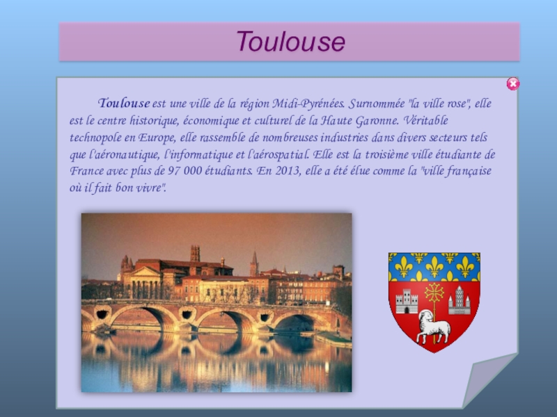Слайд 62 Toulouse est une ville de la région Midi-Pyrénées. Surnommée "la ville