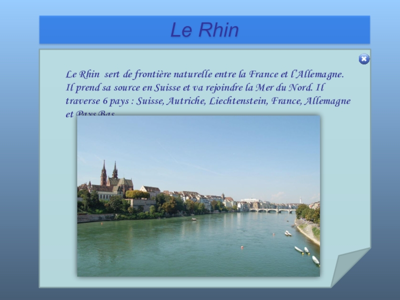 l’Allemagne. Il prend sa source en Suisse et va rejoindre la Mer du Nord. Il traverse 6 pays : Suisse, Autriche, Liechtenstein, France, Allemagne et Pays Bas.