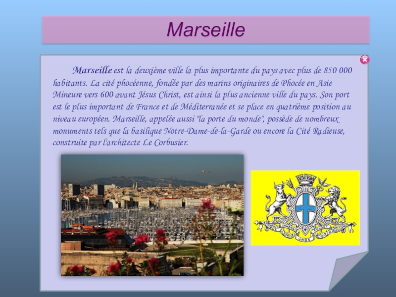 plus de 850 000 habitants. La cité phocéenne, fondée par des marins originaires de Phocée en Asie Mineure vers 600 avant Jésus Christ, est ainsi la plus ancienne ville du pays. Son port est le plus important de France et de Méditerranée et se place en quatrième position au niveau européen. Marseille, appelée aussi "la porte du monde", possède de nombreux monuments tels que la basilique Notre-Dame-de-la-Garde ou encore la Cité Radieuse, construite par l'architecte Le Corbusier.