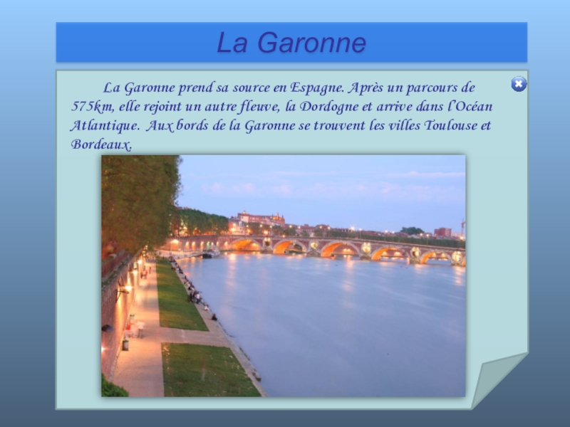 575km, elle rejoint un autre fleuve, la Dordogne et arrive dans l’Océan Atlantique. Aux bords de la Garonne se trouvent les villes Toulouse et Bordeaux.
