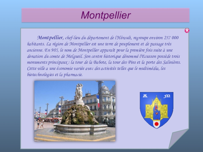 Слайд 73 Montpellier, chef-lieu du département de l'Hérault, regroupe environ 257 000 habitants.