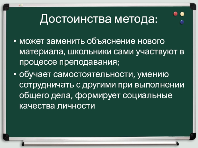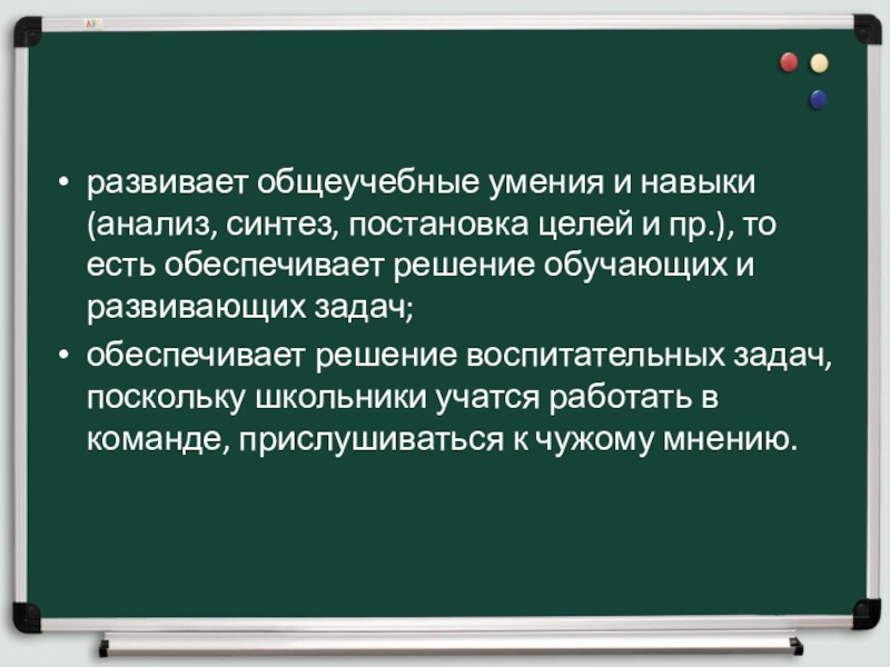обеспечивает решение воспитательных задач, поскольку школьники учатся работать в команде, прислушиваться к чужому мнению.
