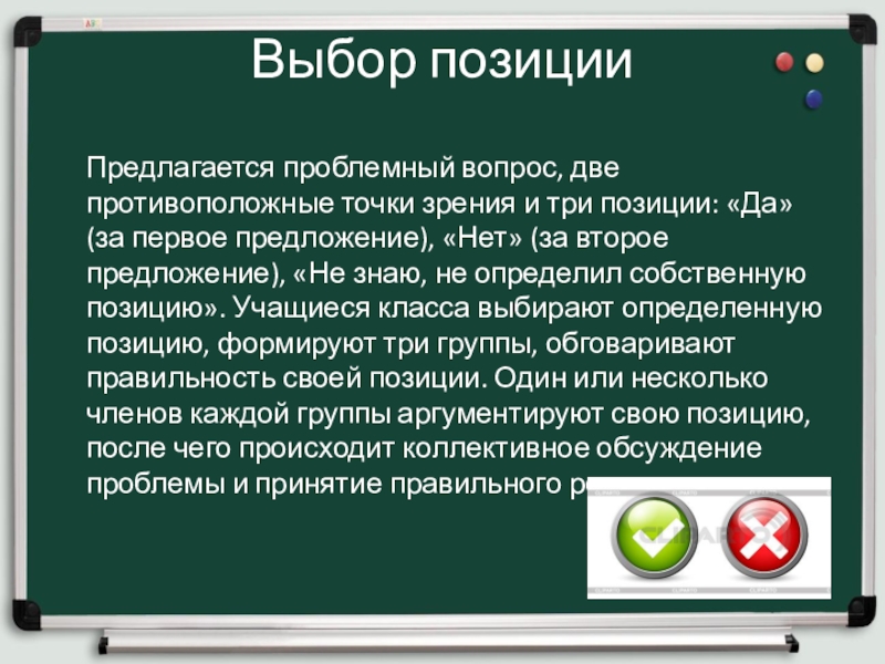 и три позиции: «Да» (за первое предложение), «Нет» (за второе предложение), «Не знаю, не определил собственную позицию». Учащиеся класса выбирают определенную позицию, формируют три группы, обговаривают правильность своей позиции. Один или несколько членов каждой группы аргументируют свою позицию, после чего происходит коллективное обсуждение проблемы и принятие правильного решения.