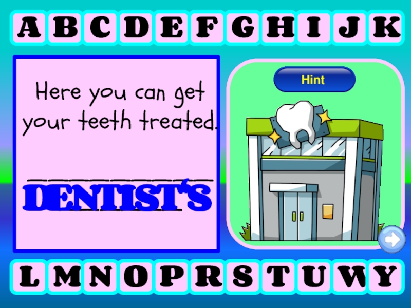 ABCDEFGHIJKLMNOPRSTUWYHere you can get your teeth treated._______________DNTETISS‘