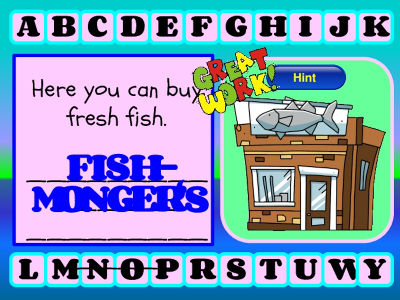 ABCDEFGHIJKLMNOPRSTUWYHere you can buy fresh fish.______________________________FISH-MONGERS‘
