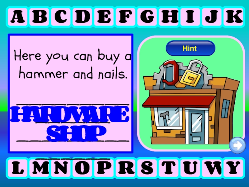 ABCDEFGHIJKLMNOPRSTUWYHere you can buy a hammer and nails.______________________________HARDWARESHOP